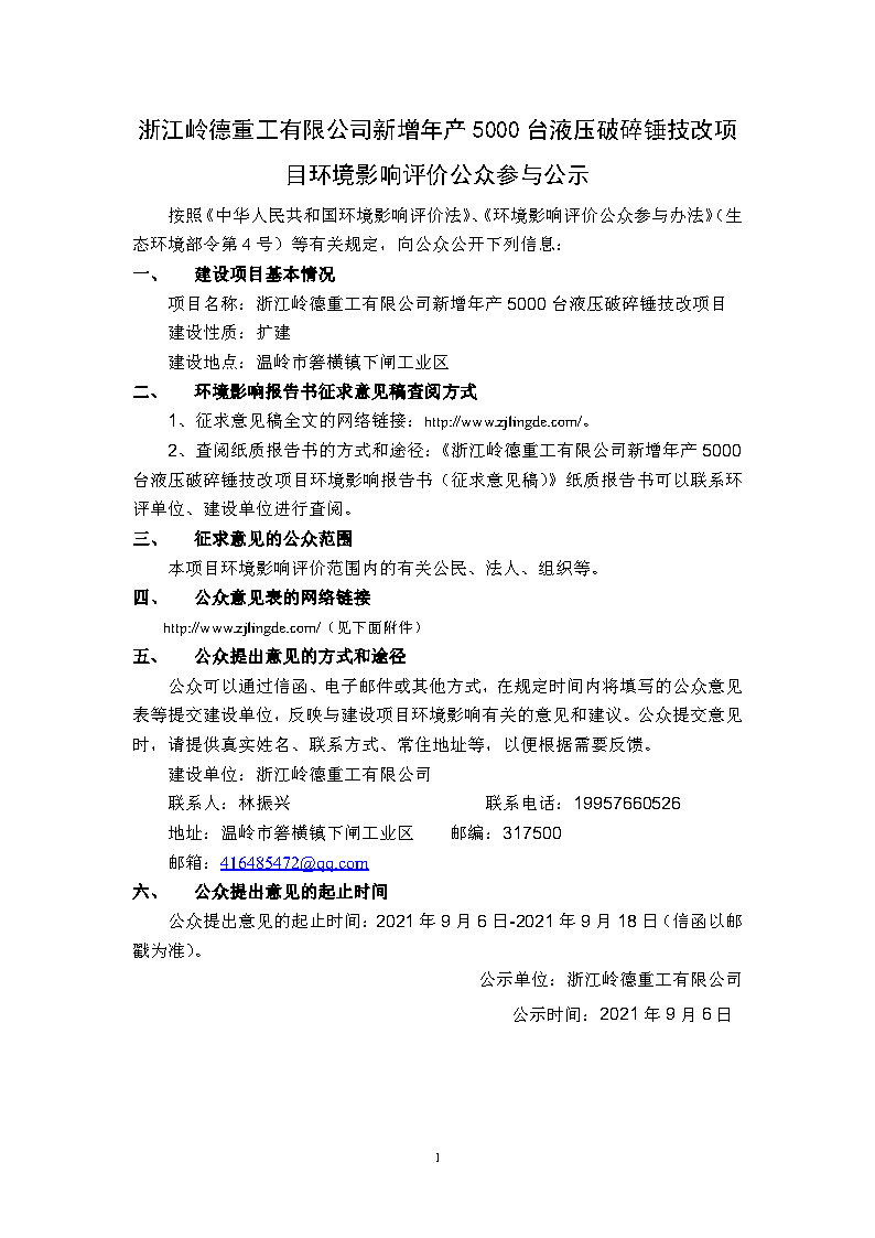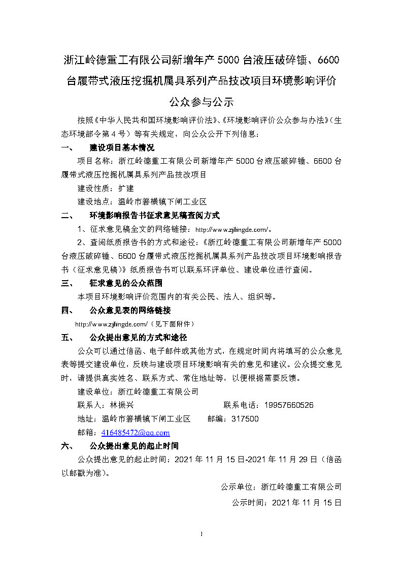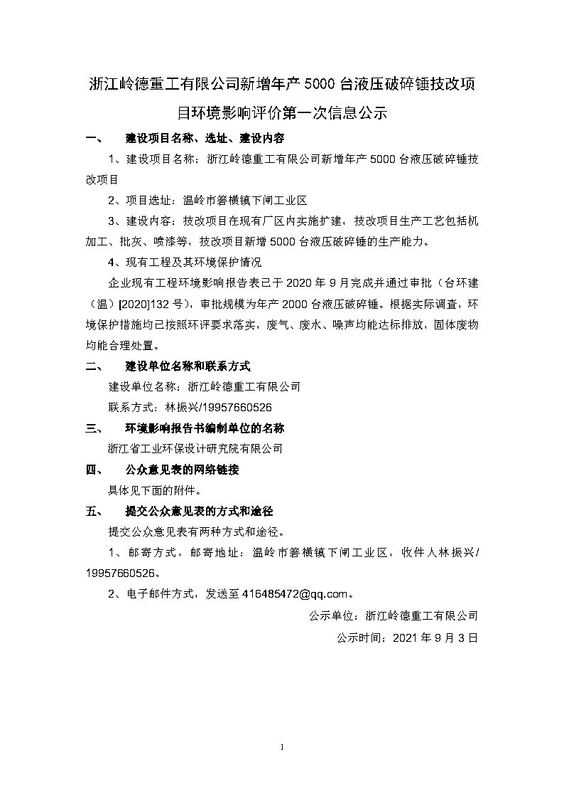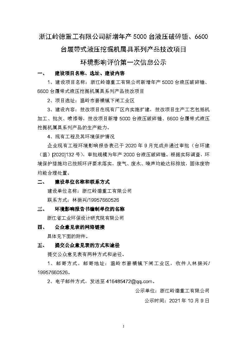 浙江嶺德重工有限公司新增年產5000臺液壓破碎錘技改項目環(huán)境影響評價第一次信息公示